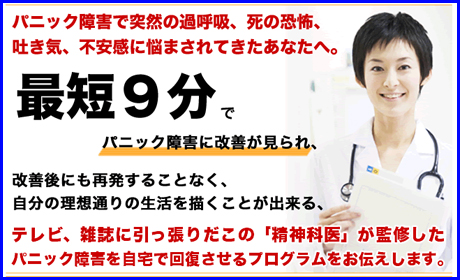 自宅で小学生程度のお子さんでも出来るほどシンプルで特別な道具も難しい知識も必要もなく簡単にパニック障害が改善できる最短9分でパニック障害を改善!?テレビ、雑誌に引っ張りだこの精神科医が監修したパニック障害改善プログラムの口コミを公開しています。
